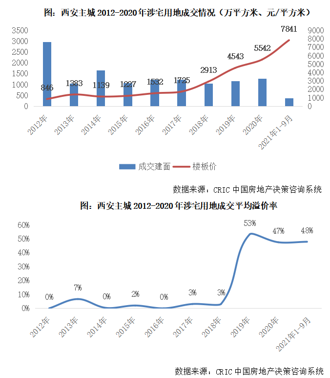 2019年,西安地市全面火爆,房企逢拍必?fù)專晟嬲玫仄骄鐑r(jià)率高達(dá)53%,一改往年宅地底價(jià)成交為主的局面,平均樓板價(jià)躍升至4543元/平方米。更具里程碑意義的是,西安宅地價(jià)格首次邁過“萬元”門檻,城東1宗以及高新4宗地塊成交樓板價(jià)每平方米“破萬”,新晉地王高新區(qū)GX3-35-7地塊樓面價(jià)高達(dá)11182元/平方米。