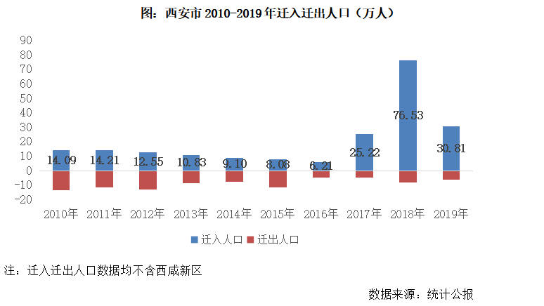 從遷出人口數(shù)據(jù)來看,2010-2015年,西安平均每年遷出10萬人以上,而2016年-2019年,年均僅6萬人遷出,遷出人口規(guī)模顯著下降直觀反映西安城市人口吸附力增強(qiáng)。