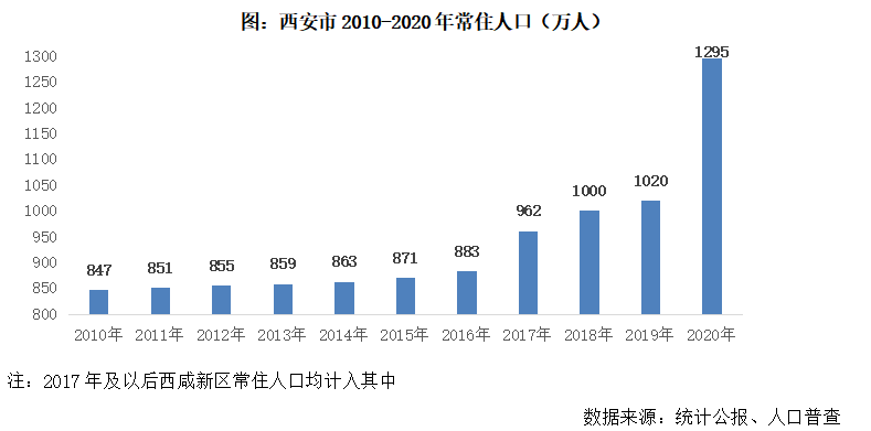 常住人口數(shù)據(jù)同樣可以印證這一結(jié)論,“七普”結(jié)果顯示,截至2020年,西安全市常住人口總量達(dá)到1295萬人,較“六普”增加448萬,剔除西咸新區(qū)行政區(qū)劃調(diào)整對(duì)人口的影響,十年常住人口增量也超過300萬人。結(jié)合統(tǒng)計(jì)年鑒公布的抽樣調(diào)查數(shù)據(jù)來看,常住人口流入主要集中在2017-2020年,前6年年均常住人口增量僅在4萬人左右。