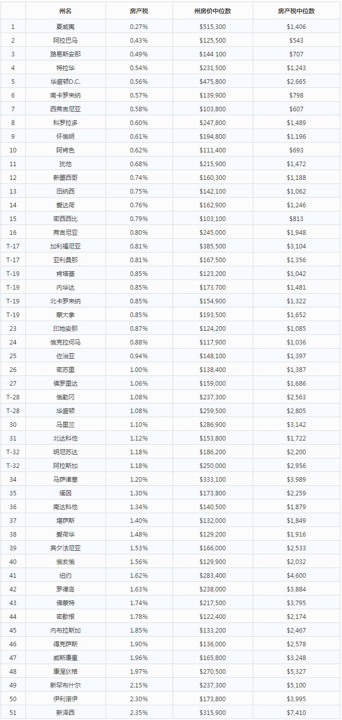 各州稅率不同,集中在0.27%~2.35%之間。事實(shí)上,美國房產(chǎn)稅雖然不低,但絕沒有大家想象的高。2017年美國政府全美普查數(shù)據(jù)顯示,當(dāng)年美國家庭房產(chǎn)稅支出中位數(shù)為2149美元,而當(dāng)年美國家庭收入中位數(shù)61372美元。房產(chǎn)稅只占家庭收入的3.5%。