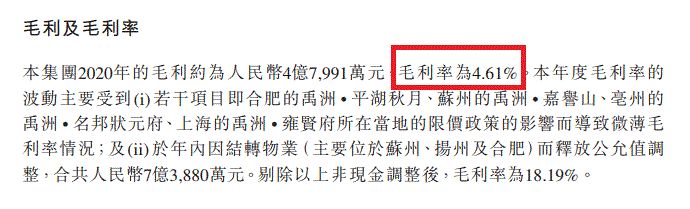 本年度毛利率的波動主要受到若干項目即合肥的禹洲 ? 平湖秋月、蘇州的禹洲 ? 嘉譽山、亳州的禹洲 ? 名邦狀元府、上海的禹洲 ? 雍賢府所在當?shù)氐南迌r政策的影響而導致微薄毛利率情況;及于年內因結轉物業(yè)(主要位于蘇州、揚州及合肥)而釋放公允值調整,合共人民幣7億3,880萬元。剔除以上非現(xiàn)金調整后,毛利率為18.19%。