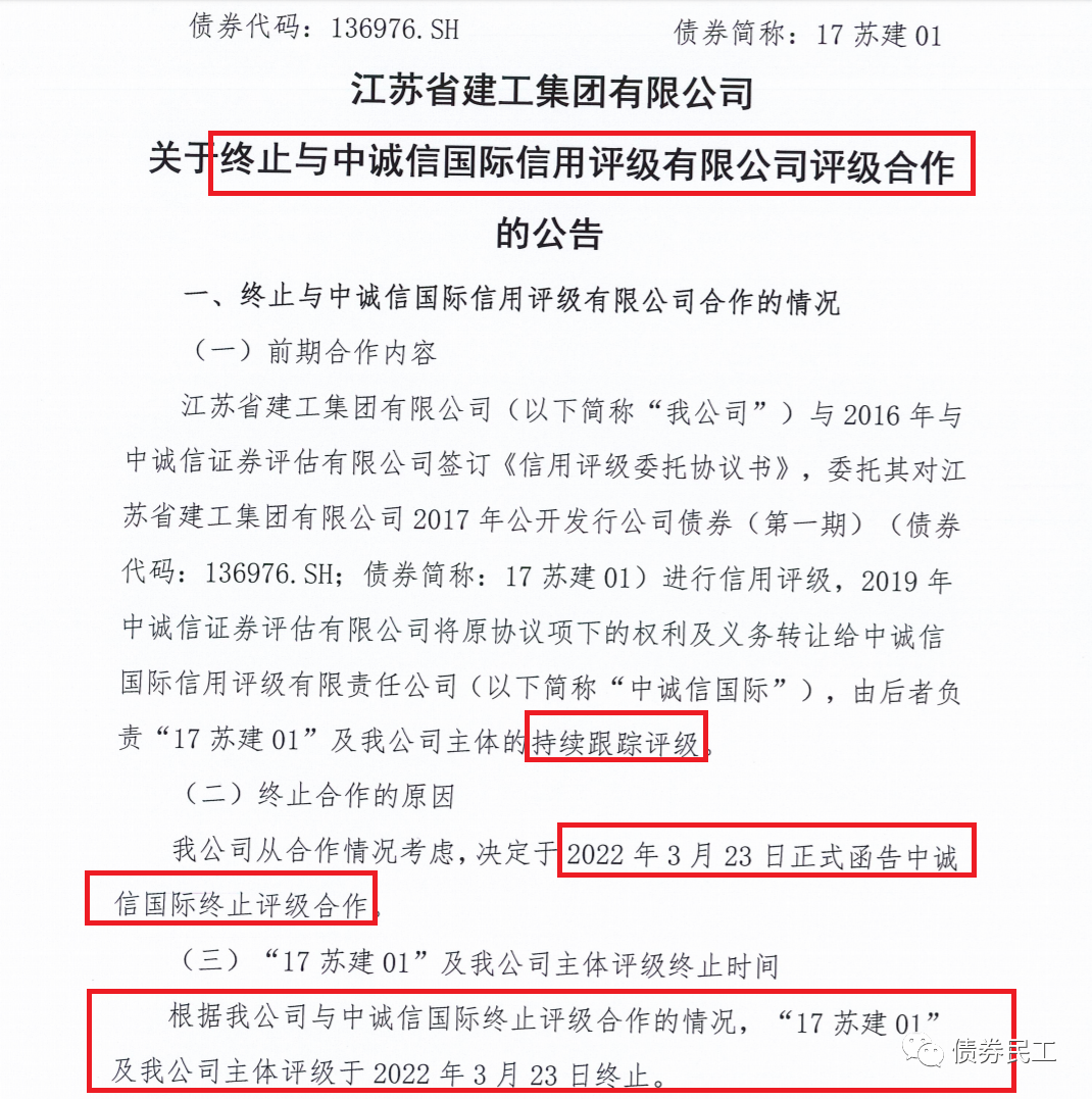 根據江蘇省建工集團有限公司(以下簡稱“江蘇建工集團”)2022年3月28日披露的公告信息,公司決定在“17蘇建01”債券上終止與中誠信國際評級有限公司的評級合作,終止合作的時間是2022年3月23日。需要關注的是,這只債券“17蘇建01”的終止日期是2022年4月5日,其實離著債券到期沒有多長時間了。