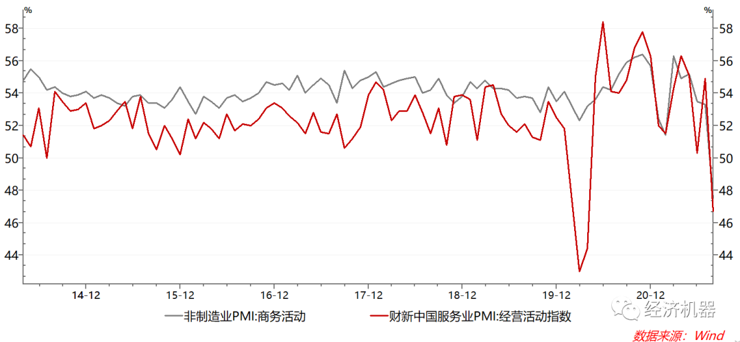 圖2、服務(wù)業(yè)PMI:官方和財新PMI
