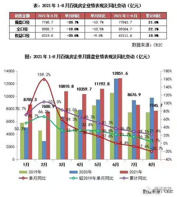 而需求“入冬”,或是壓垮地產(chǎn)商的“最后一根稻草”。8月份,百強企業(yè)單月操盤銷售金額下降20.7%,單月環(huán)比下降10.7%。剔除去年基數(shù)效應(yīng),和2019年比,增速也在快速回落(下圖、表)。在融資條件收緊情況下,銷售回款成為"去杠桿”和改善財務(wù)狀況的唯一途徑。如果需求快速惡化,則會有一大批民營開發(fā)商排隊倒下,清理出局。