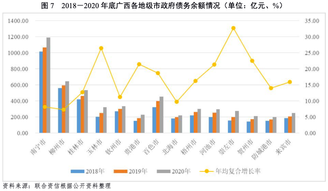 從債務(wù)層面看,廣西各地級市中,南寧市政府債務(wù)規(guī)模最大,為1189.94億元;隨后是柳州市、桂林市、百色市、欽州市和玉林市,以上5個地級市政府債務(wù)余額均在300~700億元之間。2018-2020年底,廣西各地級市政府債務(wù)余額均呈上升趨勢,其中崇左市政府債務(wù)余額增長最快,年均復(fù)合增長率達32.78%,玉林市、賀州市、貴港市和河池市政府債務(wù)余額年均復(fù)合增長率達到20.00%以上。