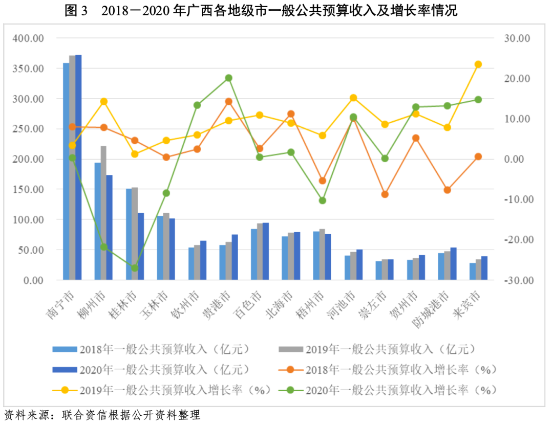 從一般公共預(yù)算收入看,廣西各地級市一般公共預(yù)算收入規(guī)模差異較大。2020年,南寧市的一般預(yù)算收入規(guī)模遠高于其他地級市,為372.25億元;超過100億元的有柳州市、桂林市和玉林市,其余地級市一般公共預(yù)算收入均低于100億元,其中賀州市、來賓市和崇左市三個地級市的一般預(yù)算收入不足50億元。增速方面,2020年,貴港市、來賓市、欽州市、防城港市、賀州市和河池市的一般公共預(yù)算收入增速超過10%,增長較快,其中貴港市以20.10%增速位居首位。北海市、百色市、南寧市和崇左市的一般公共預(yù)算收入增速在0~2%之間;玉林市、梧州市、柳州市和桂林市的一般公共預(yù)算收入均同比下滑,其中桂林市和柳州市下滑幅度大,主要系疫情期間當?shù)氐禺a(chǎn)、旅游行業(yè)景氣度下滑及2020年增值稅率調(diào)整綜合影響所致。