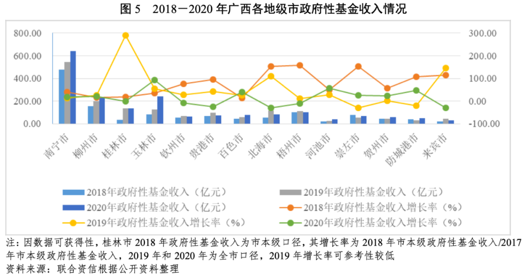 廣西各地級市中南寧市的一般預(yù)算收入和基金收入規(guī)模遠高于其他地級市,賀州市、來賓市和崇左市一般預(yù)算收入規(guī)模較小;廣西大部分地級市一般公共預(yù)算收入的穩(wěn)定性一般,財政自給能力偏弱。廣西各地級市政府債務(wù)余額呈上升趨勢,崇左市債務(wù)余額增速最快。2020年,廣西各地級市政府負債率均有所提升,但整體債務(wù)負擔相對較輕;欽州市、來賓市和防城港市政府債務(wù)率較高,償債壓力較大。