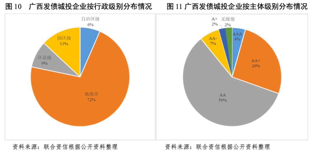 廣西發(fā)債城投企業(yè)主要為地級市城投企業(yè),區(qū)縣城投企業(yè)較少,柳州市為廣西發(fā)行城投債最多的地區(qū)。廣西發(fā)債城投企業(yè)的信用等級普遍集中在AA級別。