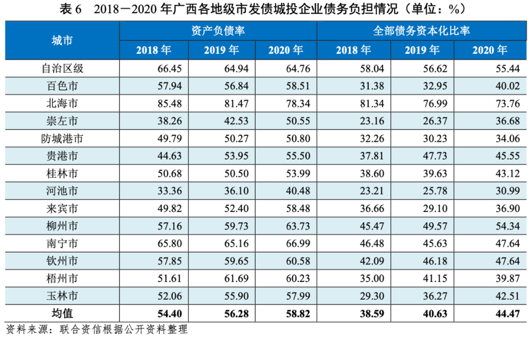 從發(fā)債城投企業(yè)債務(wù)負擔來看,2018-2020年,廣西整體發(fā)債城投企業(yè)資產(chǎn)負債率和全部債務(wù)資本化比率均值呈持續(xù)上升趨勢。其中,2018-2020年,自治區(qū)級、北海市和柳州市城投企業(yè)債務(wù)負擔相對較重。