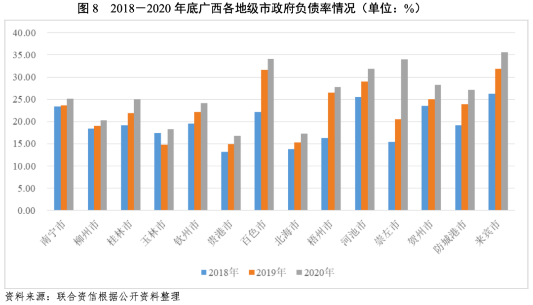 債務(wù)負擔方面,截至2020年底,各地級市政府負債率均有所提升,但整體債務(wù)負擔相對較輕。其中,崇左市政府負債率較上年底提升13.49個百分點,來賓市、玉林市、防城港市、賀州市和桂林市政府負債率均較上年底提升3~4個百分點,其他8個地級市政府負債率均較上年底提升1~3個百分點。截至2020年底,來賓市、百色市、崇左市和河池市政府負債率高于30%。