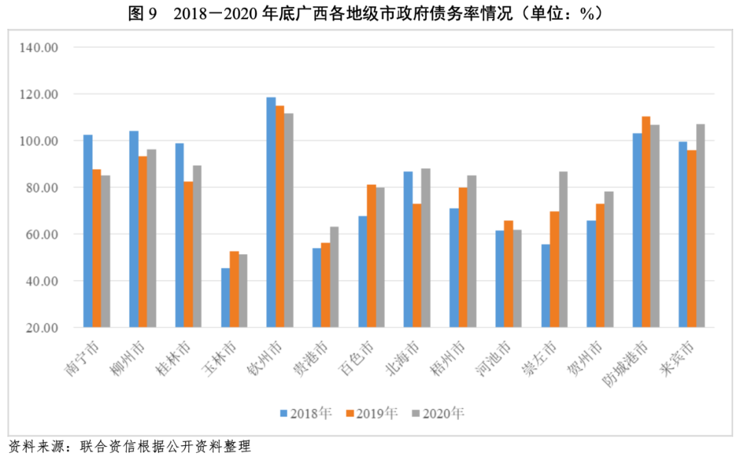 償債能力方面,截至2020年底,南寧市、玉林市、欽州市、百色市、河池市和防城港市政府債務(wù)率較上年底有所下降,崇左市和北海市政府債務(wù)率較上年底提升較快。欽州市、來賓市和防城港市政府債務(wù)率達到100%以上,南寧市、柳州市、桂林市、北海市、梧州市和崇左市政府債務(wù)率在80%~100%之間,貴港市、百色市、河池市和賀州市政府債務(wù)率在60%~80%之間,玉林市政府債務(wù)率51.25%。整體看,欽州市、來賓市和防城港市政府債務(wù)率較高,償債壓力較大。