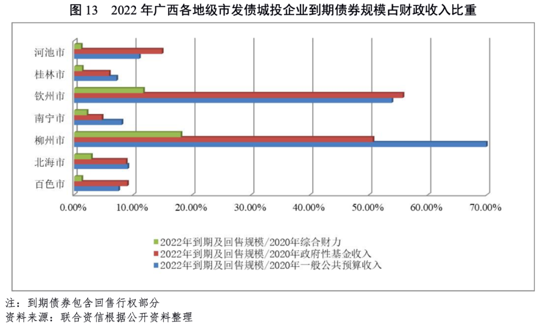以發(fā)債城投企業(yè)2022年到期債券規(guī)模占一般公共預(yù)算收入、政府性基金收入和綜合財力的比重來近似衡量2022年城投債券的到期償還能力,到期償還能力最弱的城市為柳州市,柳州市發(fā)債城投企業(yè)2022年到期債券占地方政府一般公共預(yù)算收入、政府性基金收入和綜合財力的比重分別為69.89%、50.65%和18.08%,其次欽州市到期償還壓力也較大,除柳州市及欽州市外,廣西各地級市財力對區(qū)域內(nèi)城投企業(yè)的到期債券的覆蓋程度均較高。