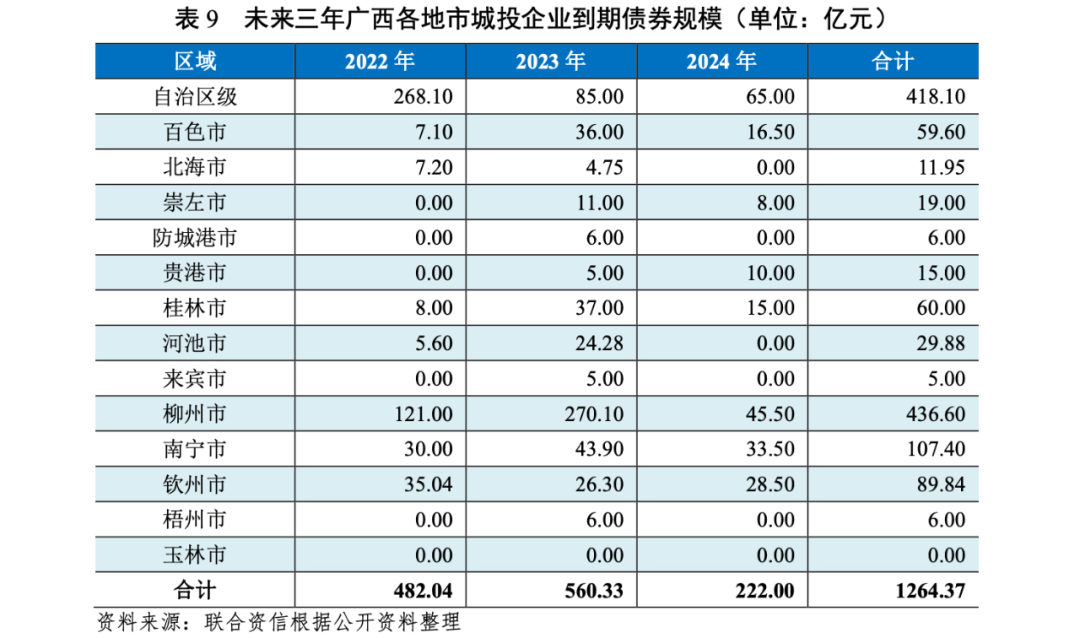 從廣西自治區(qū)級及各地市發(fā)債城投企業(yè)未來三年(2022-2024年)到期債券(包括回售行權(quán)部分)規(guī)模看,廣西未來三年到期債券規(guī)模分別為482.04億元、560.33億元和222.00億元,其中2022年和2023年存在較大集中償付壓力。