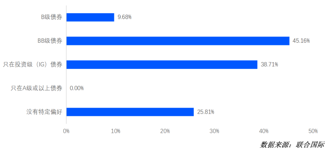 在未來12個月內,少于10%的受訪者會考慮投資B級債券。45.2%的受訪者考慮投資BB級債券,同時38.7%的受訪者只考慮投資級(IG)債券。有25.8%的受訪者在未來12個月內沒有特定偏好(見附表2)。