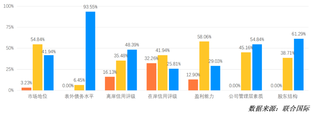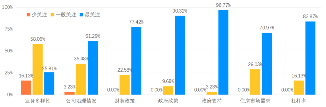 對于投資者在投資房地產債券時會考慮的因素方面,大部分的受訪者最關注發行人的公司治理情況、財務政策、政府政策、政府支持程度、住房市場需求、發行人的杠桿率、表外債務水平、離岸信用評級、公司管理層素質和股東結構。而大多數受訪者表示發行人公司的業務多樣性、市場地位、在岸信用評級和盈利能力屬于一般考慮因素。一位受訪者提到,發行人公司的是否上市也是一個考慮因素(見附表10)。