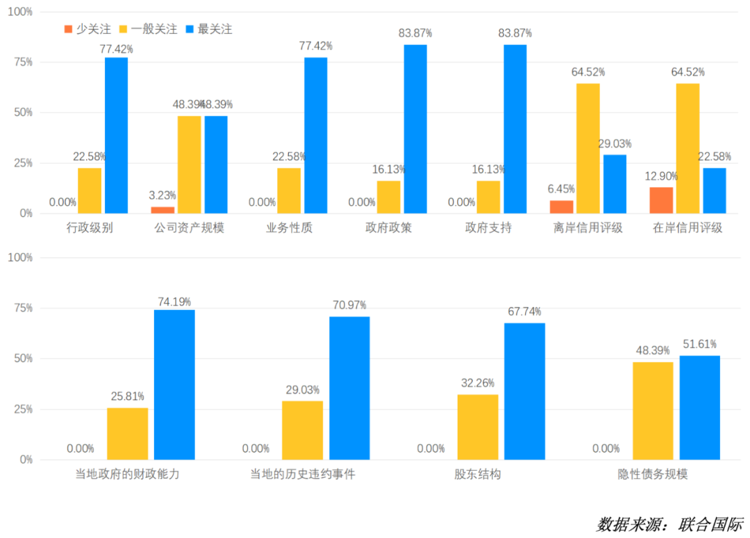 對于投資者在投資城投債券時會考慮的因素方面,大部分的受訪者最關注發行人的行政級別、業務性質、政府政策、政府支持程度、當地政府的財政能力、當地的歷史違約事件、股東結構和隱性債務規模。關于城投發行人的公司資產規模,約半數受訪者表示最為關注,約半數受訪者持一般態度。他們中許多人對離岸和在岸信用評級持中立態度(見附表11)。