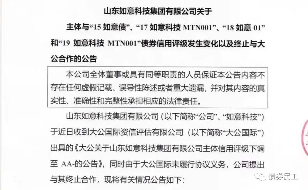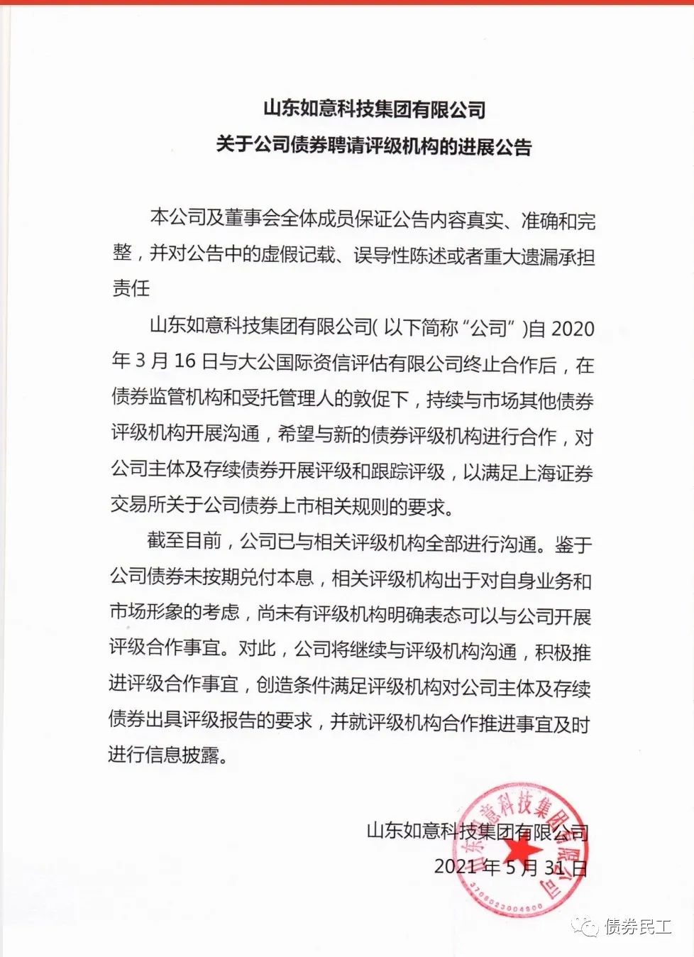 根據(jù)山東如意科技集團(tuán)有限公司(以下簡(jiǎn)稱“如意集團(tuán)”)2021年5月31日的公告,自公司2020年3月16日終止與大公國際的評(píng)級(jí)合作之后,公司與評(píng)級(jí)機(jī)構(gòu)全部溝通完畢,沒有評(píng)級(jí)公司與公司開展評(píng)級(jí)合作。這在信用債券市場(chǎng)上也是很少見的了,畢竟多數(shù)債券都需要披露跟蹤評(píng)級(jí)報(bào)告。