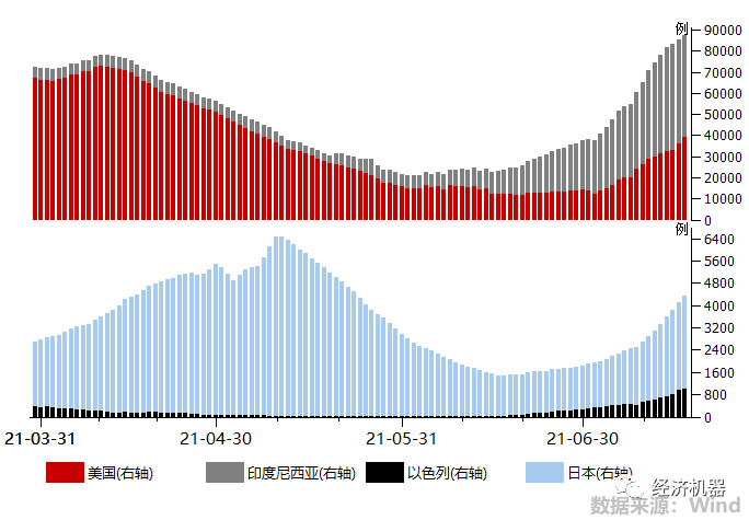 近期,美國,以色列等傳統上認為疫苗接種效果最好的國家,疫情也出現再次反彈。人口大國印度尼西亞近期感染人數出現飆升。日本疫情也出現抬升跡象。東京奧運會本周開幕,糟糕的防控水平下,很有可能成為另一個“病毒狂歡節”。此外,種種跡象表明,海外疫情再次惡化的概率在提升?!耙呙缧叛觥笔钱斍爸谓洕褪袌鲱A期的一個核心邏輯,這一信仰一旦被打破,或將對風險資產價格造成一波沖擊。