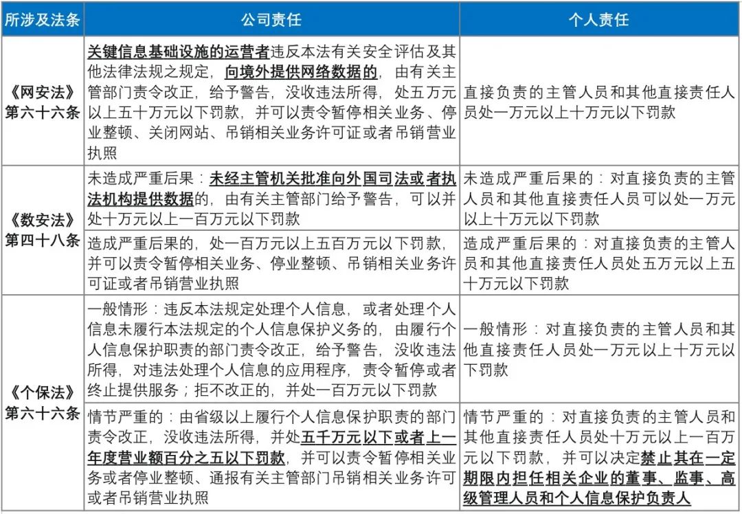 由上表可見,《網安法》對于關鍵信息基礎設施的運營者違法向境外提供網絡數據的責任承擔情況作出了規定;《數安法》第三十六條則規定“境內的組織、個人”未經許可不得向外國司法或者執法機構提供存儲于中華人民共和國境內的數據,如有違反,根據所造成的的后果嚴重程度,承擔對應的責任。