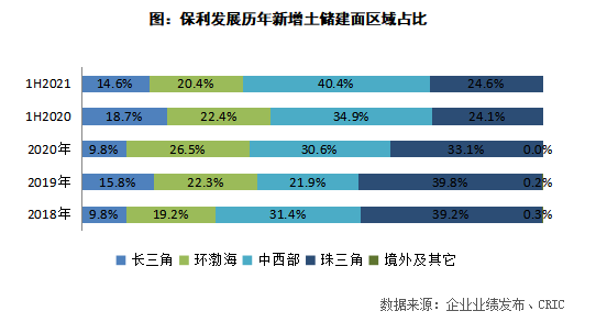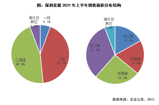 從銷售區(qū)域分布來看,2021年上半年保利發(fā)展銷售面積貢獻(xiàn)最大的區(qū)域?yàn)橹槿菂^(qū)域,占比達(dá)到32.7%,同比減少1.9各百分點(diǎn);此外中西部區(qū)域銷售面積同比增長2.4各百分點(diǎn)至25.6%,增幅最大。