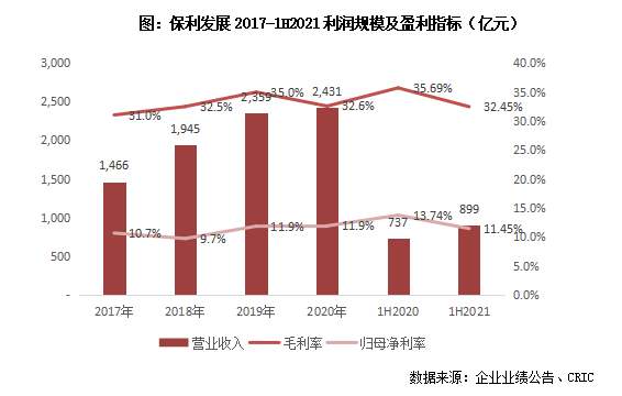 從盈利水平來看,2021上半年保利的毛利率為32.45%,同比減少3.42個(gè)百分點(diǎn),凈利率和歸母凈利率也分別同比下降1.75和2.29個(gè)百分點(diǎn)至16.34%和11.45%,盈利水平雖有所下降但仍屬于行業(yè)高位。