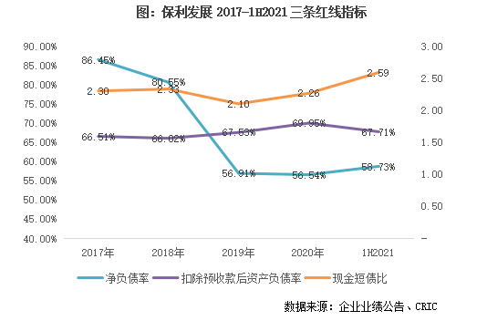 從債務(wù)結(jié)構(gòu)來看,現(xiàn)金短債比2.59,長短債比4.56,分別較2020年末增加0.33和 0.96,債務(wù)結(jié)構(gòu)持續(xù)優(yōu)化;現(xiàn)金覆蓋短債,債務(wù)結(jié)構(gòu)穩(wěn)定健康。2021上半年末保利有息債同比增加378億元,凈負(fù)債率增2.18個(gè)百分點(diǎn)至58.73%,若將永續(xù)債計(jì)做負(fù)債,則凈負(fù)債上升0.64個(gè)百分點(diǎn)至70.00%,扣除預(yù)收后的資產(chǎn)負(fù)債率67.71%,較期初下降2.24個(gè)百分點(diǎn)。