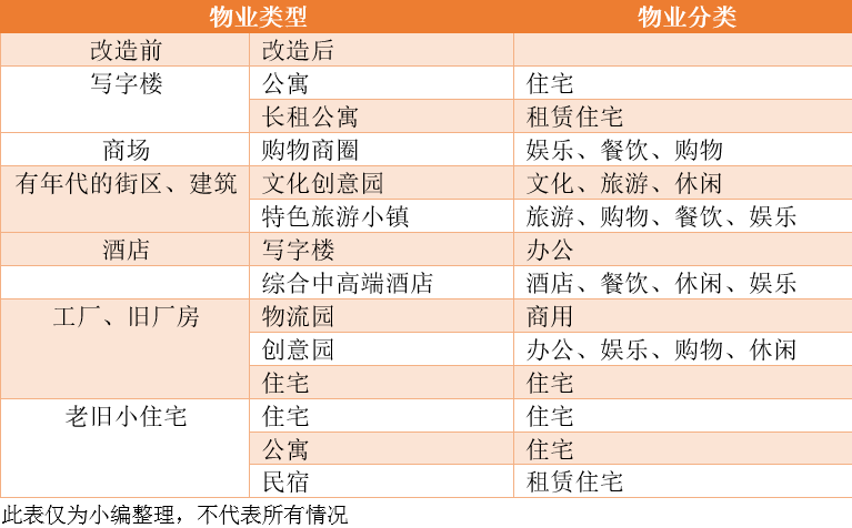 主要分為重資產和輕資產兩大類,重資產也就是持有物業,通過直接買入或者股權模式收購需要更新改造的物業,通過變更物業類型或者重新規劃定位進行改造。輕資產就是租賃,通俗點說就是“二房東”最典型的例子就是長租公寓,這種模式對團隊的運營管理及改造能力要求很高。