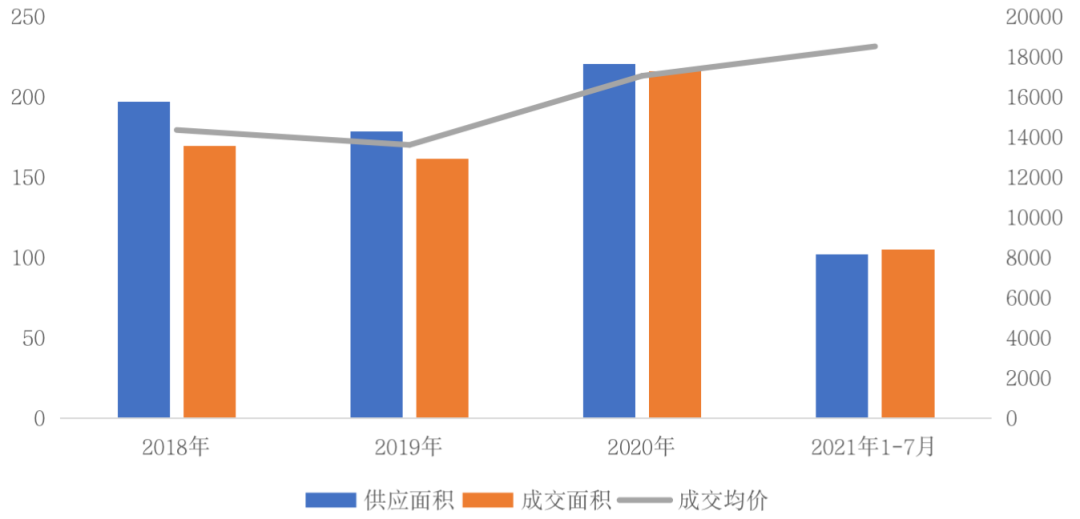 圖:2018年-2021年前7月金華主城區商品住宅供求量價(單位:萬平方米、元/平方米)