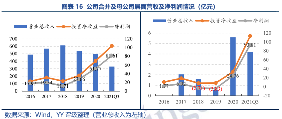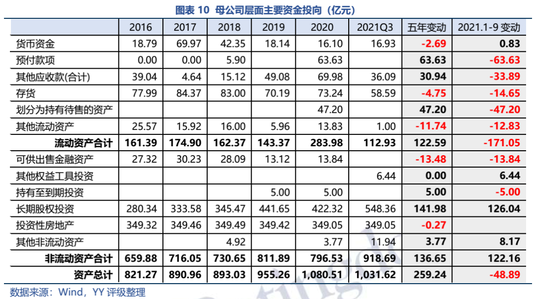母公司層面,依賴子公司運營為主,本部僅為融資屬性,營收較少,利潤依賴于資產處置。母公司資產集中在長股投和投資性房地產上,投資性房地產主要是2.5萬畝鹽田,短期變現能力弱。長股投規模持續增長,但多數市場化程度低,市場化程度較高/變現能力較強的合計約71.25億元。