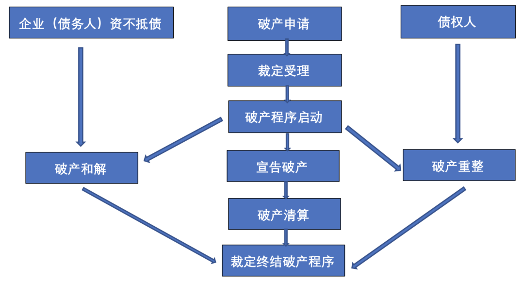 廣義上的企業(yè)破產(chǎn)程序包括清算、重整與和解程序。當企業(yè)不能清償?shù)狡趥鶆眨Y產(chǎn)不足以清償全部債務或喪失清償能力時,則企業(yè)可以根據(jù)不同情況進入不同的破產(chǎn)程序,其法律流程如下圖所示: