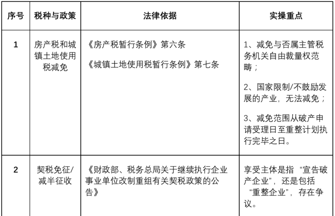 我國目前沒有專門針對破產(chǎn)企業(yè)適用的稅收優(yōu)惠政策,這也增大了在破產(chǎn)程序中對稅負成本預測的難度。筆者對目前我國破產(chǎn)程序中涉及的稅收優(yōu)惠政策整理如下(表二):