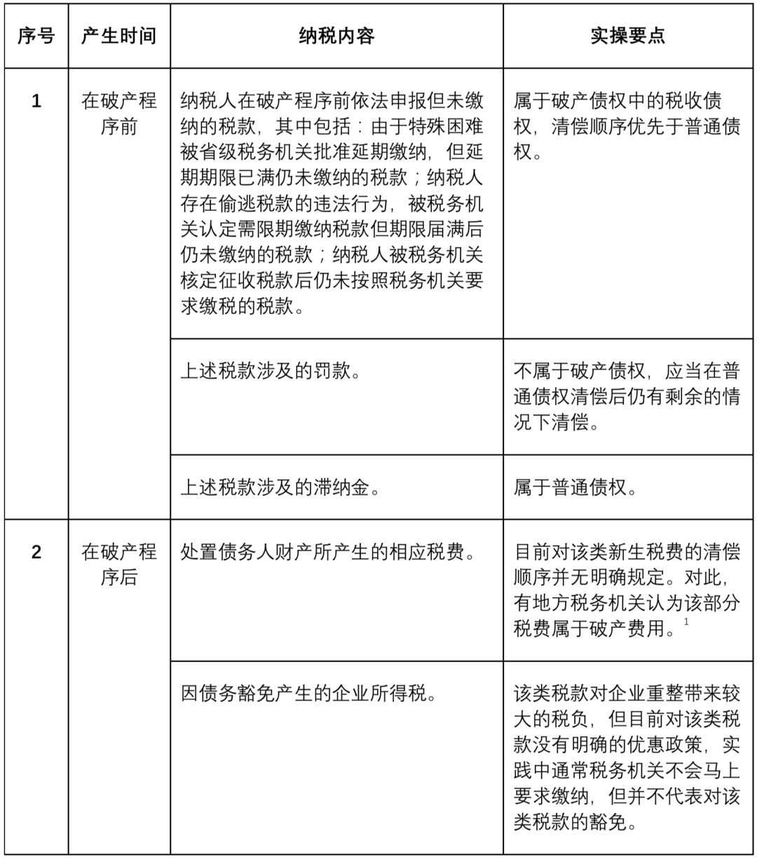 而對于作為債務人的破產(chǎn)企業(yè)而言,其涉稅內(nèi)容在破產(chǎn)法項下有特別的規(guī)定與要點,由于債務人所需承擔稅負直接影響到破產(chǎn)財產(chǎn)的分配情況,或是重整計劃/和解協(xié)議的執(zhí)行,對債權人而言十分重要,因此筆者作了如下梳理(表一):