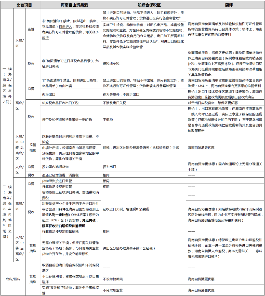 附件:海南自貿港海關監管特殊區域制度與一般綜合保稅區的政策對比