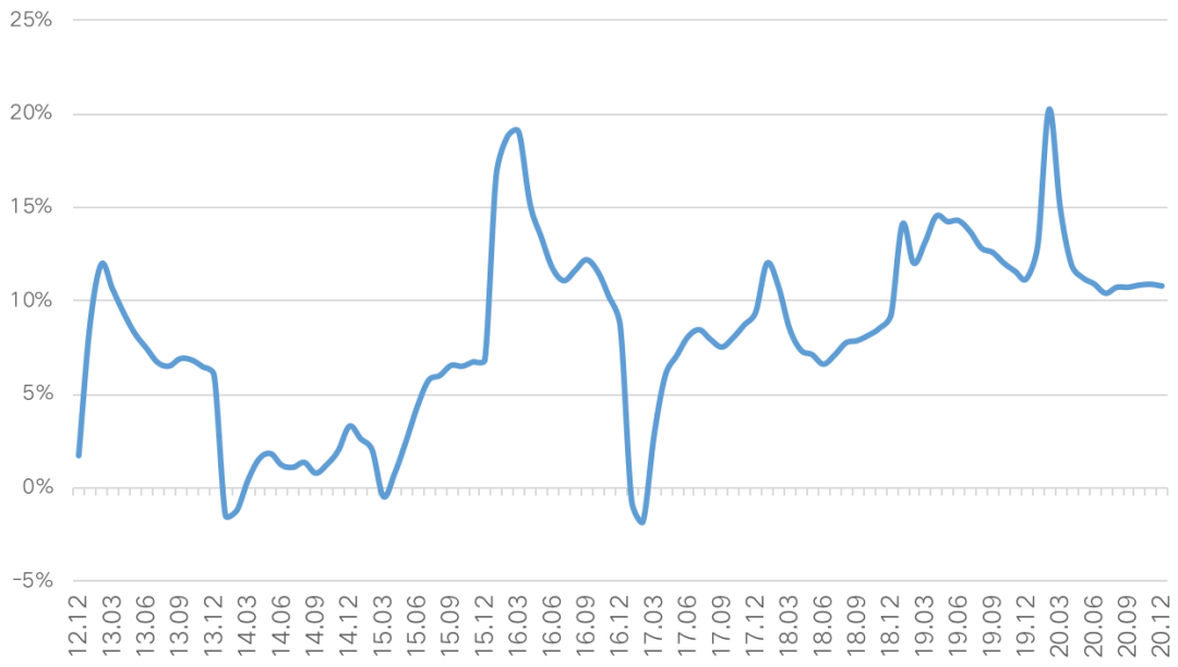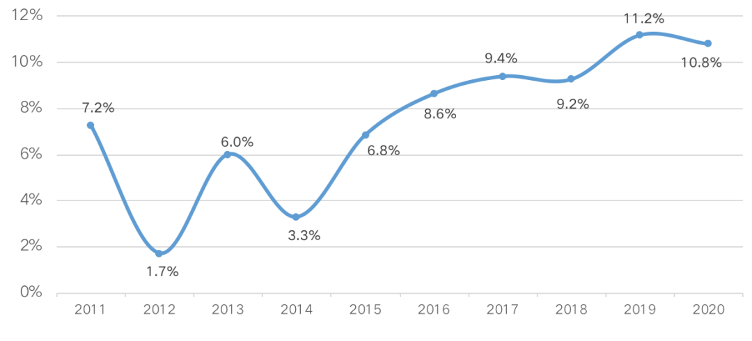 從近十年全國百城房價漲幅情況來看,2012年房價漲幅最低,至2018年漲幅均在10%以下,2019年百城房價漲幅達到了11.2%至近十年來制高點,2020年百城房價漲幅有所回落,但仍然高位運行。