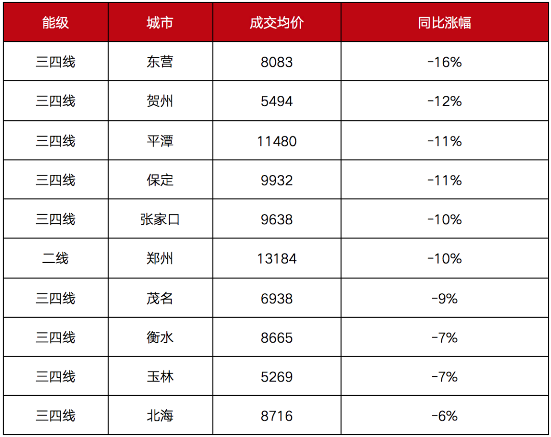 表:2020年100城新建商品住宅成交均價跌幅TOP10(單位:元/平方米)