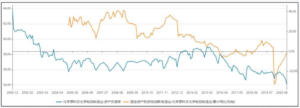 圖5  化工行業投資與行業資產負債率對比(單位:%)