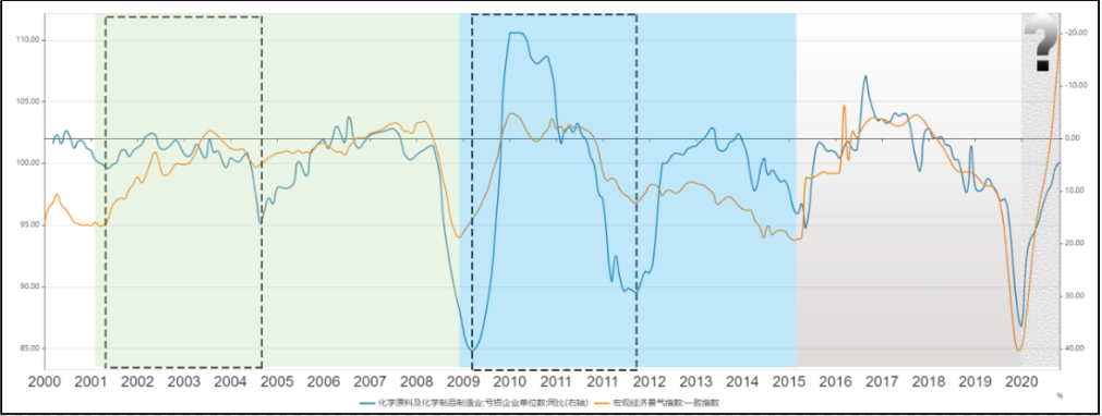 在圖3中,近二十年間我國宏觀經濟經歷了兩輪較顯著且較為完整的經濟周期波動,第一輪是2001~2008年,第二輪是在2008~2015年,兩輪周期均為七年左右,而每輪宏觀經濟周期下化工行業景氣度又各經歷了兩輪小周期波動。按照上述運行節奏,2020~2022年應正處于一輪宏觀經濟周期的尾聲或經歷一輪化工行業小周期。但2020年初突如其來的疫情打亂了我國經濟運行的節奏,化工行業和宏觀經濟景氣度加速探底,讓原本七年一輪的宏觀周期和三年輪的行業小周期變得難以判斷。