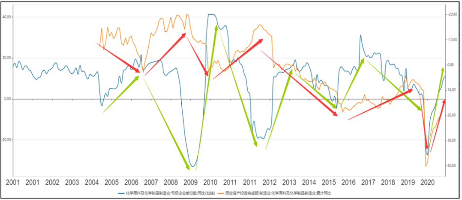 可以簡單梳理其中邏輯:國內化工行業以中低端基礎化工為主,行業產能相對過剩,因此資本的進入很容易加劇行業競爭進而影響行業景氣度。具體表現為,迅速增加的供給能力無法與市場需求匹配,導致行業階段性過剩,企業盈利能力隨之下降,虧損企業數量增加,同時,預示著行業景氣度下行。而行業景氣的下行會逐漸打消潛在資本的進入欲望,直至行業景氣度的低谷,資本對行業的投入便不再增加并在之后逐步減少。隨著市場需求增長,市場逐步消化既有產能,供需關系逐步改善,行業景氣度從低谷上行。