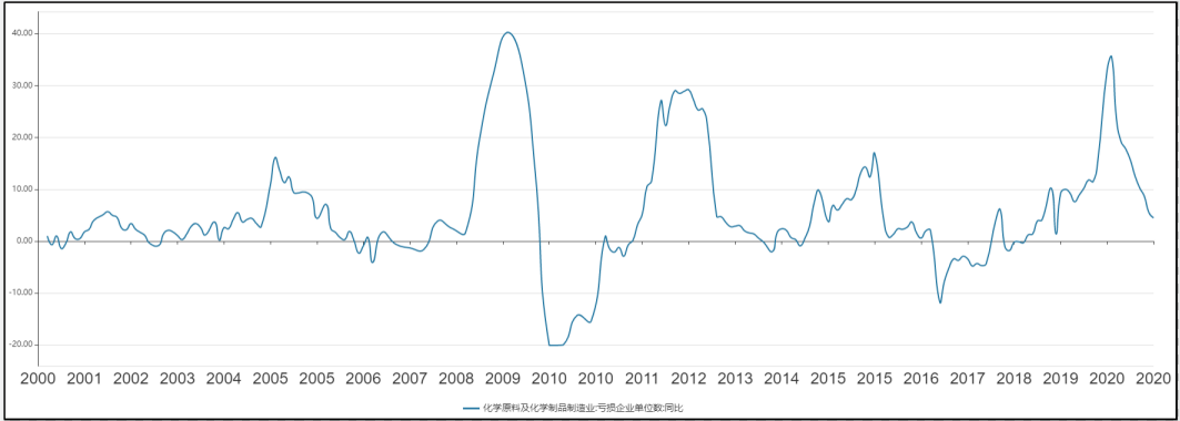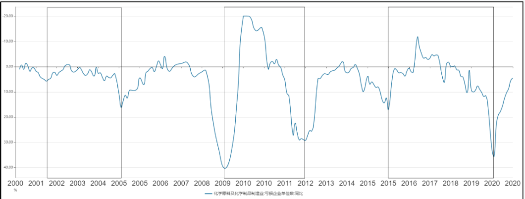 經過對多年數據分析,雖然每家化工企業經營情況各有不同,但在相對充分市場化競爭的格局下,徘徊在盈虧邊緣化企的變化更能敏感的反映行業景氣度變動,因此,我們可以用化工行業虧損企業家數同比的變化較為直觀的反映行業的興衰。我們通過對國家統計局公布的近二十年化學原料及化學制造業虧損企業家數同比數據進行整理,繪制出圖1。在圖中可以清晰的看出近二十年國內化工企業虧損數量在不同時期波動差異較大,同時,也反映出我國化工行業近二十年行業景氣度大幅波動的現狀。