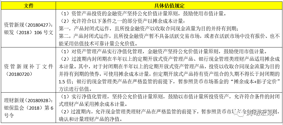 (四)凈值化轉型是大勢所趨,目前就整個大資管行業來看,資管新規、理財新規、中基協的估值指引以及中銀協的理財產品會計核算指引和理財產品核算估值指引算是針對資管產品估值最權威和最基本的指引性政策文件。整體來看,一系列政策文件在過渡期內允許符合一定的封閉式產品以及現金管理產品采取攤余成本法之外,均鼓勵對資管產品以公允價值(含市價)方法進行估值。隨著資管新規過渡期臨近結束,2018年的“720補丁”文件也自然無法再適用了。