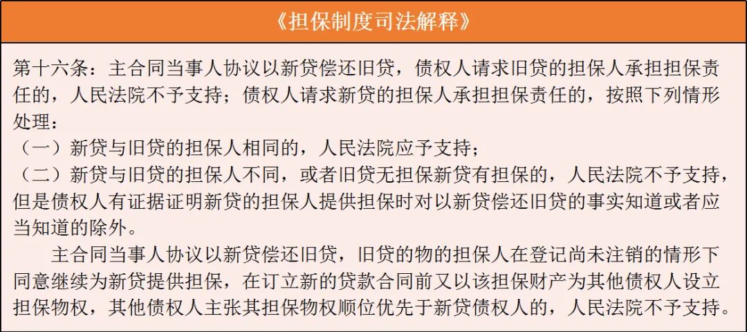 主合同當事人協議以新貸償還舊貸,舊貸的擔保人不再承擔擔保責任。債權人請求新貸的擔保人承擔擔保責任時,若新貸與舊貸的擔保人不同,或者舊貸無擔保而新貸有擔保的,則新貸的擔保人不承擔擔保責任,但是債權人有證據證明新貸的擔保人提供擔保時對以新貸償還舊貸的事實知道或者應當知道的除外。法條鏈接: