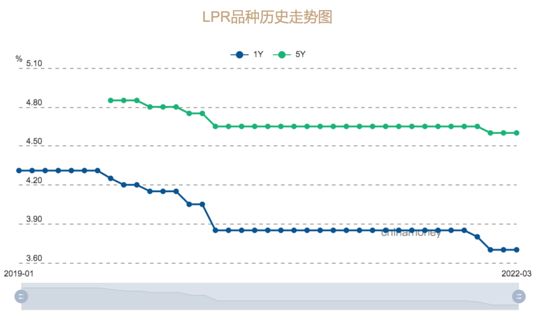 在此之后,2022年至今5年期LPR一直保持較低水平。2022年3月21日,最新公布的LPR數據顯示,2022年3月1年期LPR和5年期LPR與上個月持平,分別為3.7%和4.6%。