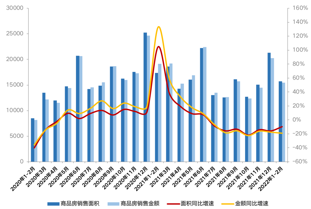 從銷售數據來看,國家統計局數據顯示2022年1-2月,商品房銷售面積15703萬平方米,同比下降9.6%;商品房銷售額15459億元,下降19.3%。兩者增速為2016年以來7年次低,僅高于2020年1-2月。
