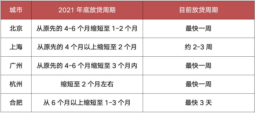 北京在2021年底放貸周期從4-6個月縮短至1-2個月的基礎上進一步加快,部分銀行一周內即可放款。上海房貸發放審批周期也從2021年底4個月以上縮短至2個月的基礎上進一步加快,縮短至2-3周。廣州和杭州的個別銀行也和北京一樣最快一周就能放款。在我們的調研中,放款時間最短的是合肥,據某銀行工作人員表示:“目前我了解到的,肥東這邊有銀行最快可三天放款,當然具體的還是得看銀行的要求。”