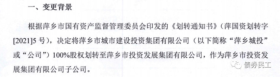 3、2021年12月1日,萍鄉市城市建設投資集團有限公司公告,將公司100%股權劃轉至萍鄉市投資發展集團有限公司,作為萍鄉市投資發展集團有限公司子公司。