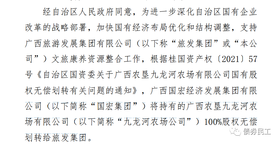 1、2021年12月8日,廣西旅游發展集團有限公司披露公告,廣西國宏經濟發展集團有限 公司將持有的廣西農墾九龍河農場有限公司100%股權無償劃轉給旅發集團。