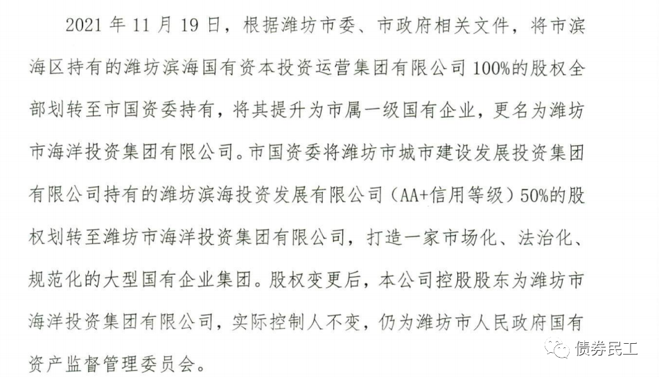 5、2021年11月19日,濰坊濱海投資發展有限公司公告,市國資委將濰坊市城市建設發展投資集團有限公司持有的本公司50%的股權劃轉至濰坊市海洋投資集團有限公司。