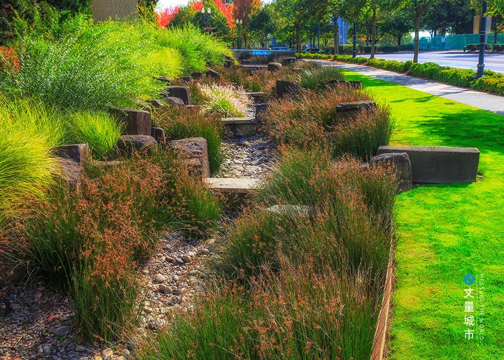 俄勒岡會議中心延伸地帶的雨園,就開創了海綿城市建設的先鋒,項目不僅巧妙地解決了雨水排放和過濾的問題,同時還創造了優美的景觀環境空間。
