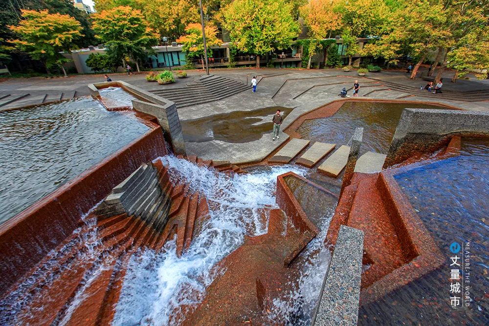 除了這種純粹空間的連接,美國景觀設計大師勞倫斯·哈普林的代表作波特蘭系列城市廣場綠地這一序列化敘事的景觀,更是將小尺度空間在更高的主題層面擰成了一個整體。