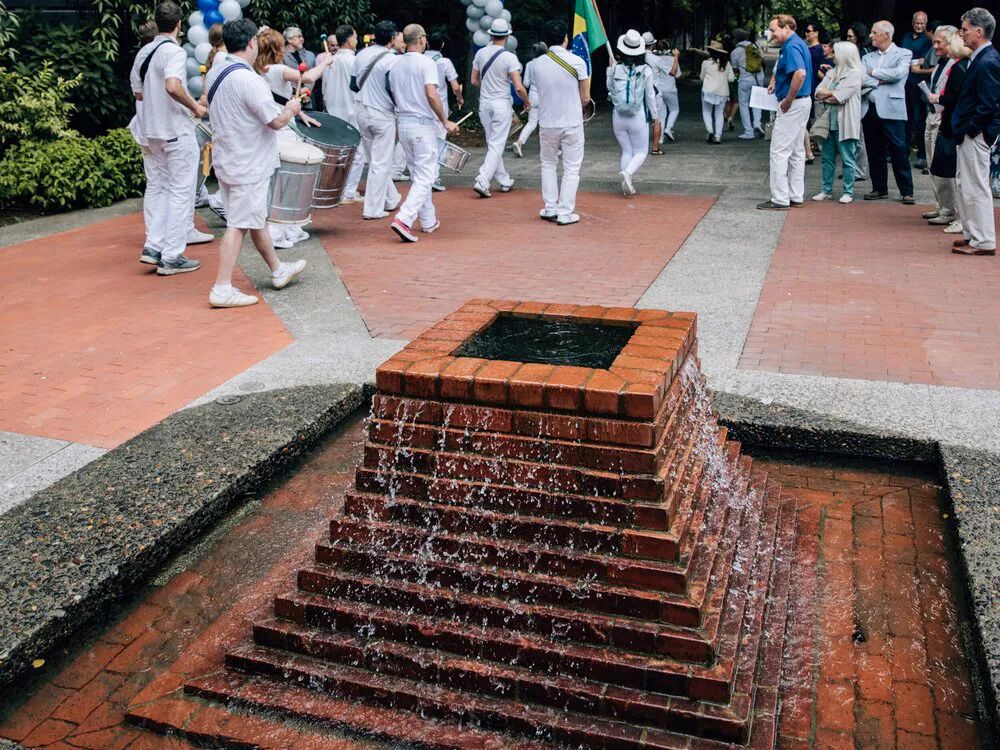 以瀑布為主題的第四站——演講堂前庭廣場是是整個系列的高潮。哈普林是從俄勒岡州瀑布山脈、哥倫布河的波尼維爾大壩中找到了設計原型。